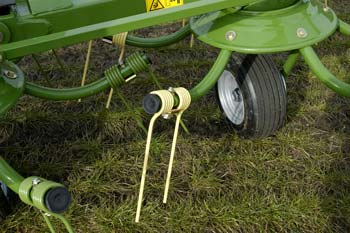 Pripenjalni stolp opornima nogama. Za odpenjanje preklopimo oporni nogi in nato odložimo kardansko gred na nosilno oporo. Tudi po delu stojijo KRONE vrtavkasti obračalniki povsem varno.